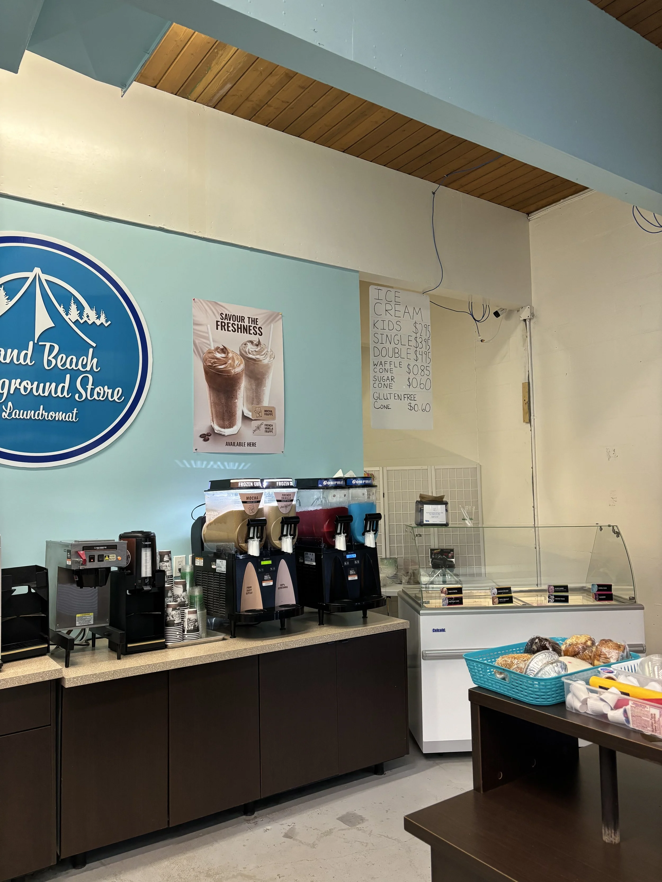 Grand Beach Campground Store is the convenient heart of the campground at Grand Beach Provincial Park, open daily with extended weekend hours to serve campers and beachgoers alike. Conveniently situated near the Ancient Beach Trailhead and campground loop, this bright, welcoming store offers everything you could need during your stay—from cold beverages and snacks to ice cream treats like their popular s’more waffle sundaes.